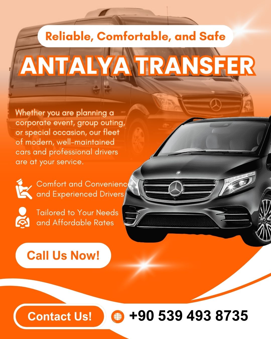 You can reach us 24/7 and instantly get information about all the details. Experience the privilege of safe, comfortable, and timely transportation to every corner of Antalya with us.